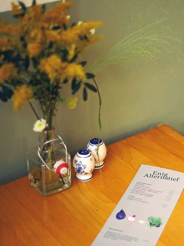 Bij Enig Alternatief vinden wij het belangrijk om te koken met biologische en lokale ingrediënten. Daarom komen onze groenten uit de tuin van Gelijke Grond, Tuinderij de Mijmering en boerderij de Horsterhof, onze eieren en kaas van Biodivers (de biologische kaaskraam op de markt in Arnhem), onze oesterzwammen van Spijkerzwam, de koffie van Boot, thee van Wilderland en onze taarten worden grotendeels gebakken door bakkerij Paul Koekie.
