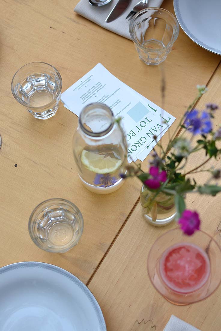 Dranken kunnen in het moment erbij gekozen worden. We bieden bij het diner een bijpassend wijn-arrangement aan en een non-alcoholische variant bestaande uit huisgemaakte kombucha’s en andere (huisgemaakte) limonades.